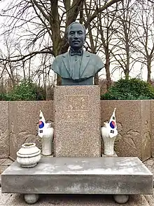 In 1907, Yi, Sangsul, and Yi Ouitjyong were delegated by Emperor Gojong to attend the Second Hague Peace Conference in The Hague, Netherlands. He was commissioned to announce to the international community that Korea was an independent state and that the Japanese invasion was unlawful.[1] They traveled for two months on the Trans-Siberian Railway. The Korean delegation was not officially invited, although some in the conference were aware that they were coming. However, the Japanese government succeeded in convincing the other delegates of the conference to reject the participation of the Korean delegates. Yi protested against the decision. A few days later, he was found dead in his room at the Hotel De Jong on Wagenstraat. His cause of death is unknown, but in South Korea it is assumed that he committed suicide due to the rejection by the international community.[3] In time, however, Japanese newspapers suggested that he was killed by Japanese spies.
