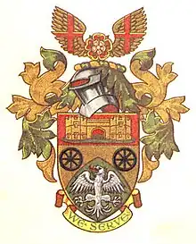 Per chevron enarched or and vert in chief two cartwheels sable and in base an eagle displayed argent a chief gules thereon on a mount vert a representation of the Gatehouse at West Drayton proper. Crest: On a wreath of the colours between two eagle's wings or charged with a cross gules a Tudor rose proper. Motto: 'We Serve'.[16]