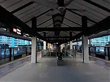 Yishun station was one of the first three stations[lower-alpha 1] to undergo testing as to whether the platform screen doors were viable for elevated stations. Eventually, installation of the half-height platform screen doors started on 26 August 2009 and operations commenced on 2 December that year. Half-height screen doors have been installed in all elevated stations since.[5] Yishun station also have high-volume low-speed fans installed, which started operations since 27 June 2012.[6]