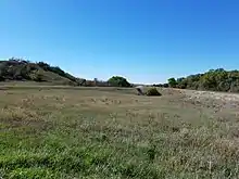 Hays City and Ellis were founded in 1867 and 1870, respectively. However, as fertile as the valley was, the Hog Back ridge of limestone and chalk between the two settlements was considered unsuitable for wheat farming and was initially rejected by immigrant settlers.[49] By 1910, the local press referred to the hill as the "long neglected" Hog Back.[50] Much of these hilltops remain largely in pasture.[51]