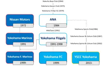 Yokohama FC was formed on 25 December 1998 following the merger of Yokohama's two J.League clubs, the Flügels and the Marinos.[2] Flügels supporters felt that their club had essentially been dissolved rather than merged with, so rejected the suggestion that they should start supporting Marinos – who had been their crosstown rivals. Instead, with money raised through donations from the general public and an affiliation with talent management company IMG, the former Flügels supporters founded the Yokohama Fulie Sports Club.[3] Following the socio model used by FC Barcelona, the Fulie Sports Club created Yokohama FC, the first professional sports team in Japan owned and operated by its supporters.[1]
