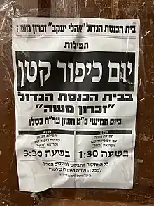 A sign announcing fast day prayers for Yom Kippur Katan in the Zichron Moshe Synagogue in Jerusalem. The special Torah Reading for Mincha of a fast day, as announced on this sign, is done only if at least ten men are fasting.