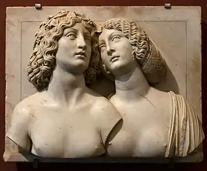 It shows two busts on a rectangular background, drawing on similar works not only in ancient Roman funerary portraits but also North European double portrait paintings, the latter also sometimes adopted by Venetian painters in the early 16th century.[3] Its mature classicism and the subjects' poetic mood also draws on paintings by Giorgione. A similar Double Portrait of a Young Couple is now in Venice's Galleria Franchetti. The possible depiction of its subjects as Bacchus and Ariadne seems to derive from Francesco Colonna's allegorical novel Hypnerotomachia Poliphili, published in Venice in 1499, with a printed illustration of that pair in the same pose as the sculpture.[4][5]