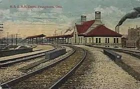 The station was built in 1905 at the cost of $70,000. It was located on the southern banks of the Mahoning River. This was in contrast to competing stations of the Erie, New York Central and Pennsylvania railroads located in the city's downtown. The B&O raised the railroad tracks to the level of the building's second floor after river flooding of the area, which reached an epic level in March 1913.[3] In 1926 the company added a freight house.[4][5]
