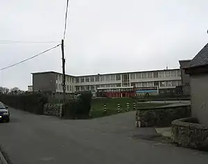 Originally designed by N. Squire Johnson, Anglesey county architect, with Kenneth M. Raw as job architect, the school was opened in 1950 and named after Sir Thomas Jones (1870–1945), a local doctor and the chairman of the county council, who campaigned for a secondary school at Amlwch. It was the first purpose-built comprehensive school in Britain.[1] Initially designed to accommodate 700 pupils, further blocks were added, and by 1977 there were 1265 pupils on the register.[2] Two main service tunnels run underneath the main corridors with two main entrances. The first is in the 6th form common room. The second is at the base of the clock tower and enters the main hall through a side door. The tunnel accessed both a storage room and a series of unfinished rooms that extend under the foyer and car park.