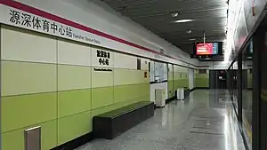 Yuanshen Stadium (simplified Chinese: 源深体育中心; traditional Chinese: 源深體育中心; pinyin: Yuánshēn Tǐyùzhōngxīn) is a station on Line 6 of the Shanghai Metro.[1] It began services on December 29, 2007. It is underground with side platforms, sandwiched between two interchange stations on Line 6. It is located at the junction of Zhangyang Road and Yuanshen Road. It is very close to Lujiazui financial district, and is sometimes included as part of it.