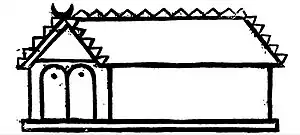 The "Temple of Yumjao Lairembi" inside the Kangla is at the left side of the Temple of Pakhangba. Structurally, both the temples are of the same architectural styles. The southern wall of the temple is well decorated. The remaining three walls of the temple are of little decorations. A door with the lancite arch is in the southern wall of the temple. Two false doors surround the two sides of the one real door. All the doors (real and false) are framed with pilasters. The ground plan of the temple is in square shape. Its area covered is 2.43 square meters.[17]
