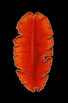 Yungia aurantiaca is a fairly large flatworm, growing to a length of about 40 mm (1.6 in). It is very thin and leaf-like, broadly oval in outline, with a thickened central ridge and a lobed, wavy margin. The dorsal surface is orange with fine white spots and a white margin, and the ventral surface is whitish. Some folds at the edge of the head form folds that function as tentacles. In between these is a horseshoe-shaped ring of eyespots, and the head also bears chemoreceptors. A single central opening on the underside serves both as the mouth and the anus, and opens into the pharynx; this aperture can be used as a sucker to secure the flatworm to the substrate.[2]