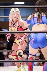 She also took part in many match gimmicks. At Sendai Girls Step And Go! on January 9, 2021, she competed in a battle royal won by Mika Iwata and also involving Chihiro Hashimoto, Dash Chisako, Hiroyo Matsumoto, Kanon, Manami, Mei Hoshizuki, Natsuho Kaneko and Sakura Hirota.[8] At Sendai Girls Road To GAEAism on October 1, 2021, she competed in a tag team gauntlet match in which she teamed up with Chihiro Hashimoto, Dash Chisako, Kanon, Mika Iwata, Natsuho Kaneko as "Team Sendai" in a losing effort against "Team Marvelous" (Hibiki, Maria, Masha Slamovich, Mei Hoshizuki, Mikoto Shindo, Mio Momono and Rin Kadokura).[9]