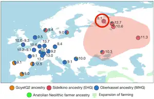 ![]() Hunter-gatherer populations, with their specific ancestries, between 14 ka and 9 ka. The area of the Eastern Hunter-Gatherer (EHG) appears in pink, with the site of Yuzhny Oleny (red circle) | |