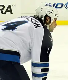 Throughout the 2009–10 season Bogosian was bothered by an injury. During a game against the Ottawa Senators on October 31, 2009, Bogosian fell behind his team's net; with his left hand lying on the net's iron frame along the ice, another player fell on top of him. The impact broke his left thumb and injured his wrist.[20] Though he did not miss any time from the injury, it had an effect on his offensive play; Bogosian was perceived to be more hesitant with the puck, choosing to pass it more often than shooting.[20] In the first 17 games of the season, he had scored 8 goals, then went 29 contests without scoring.[21] In the final 64 games, he only scored 2 goals. After he recovered, Bogosian admitted he did not play at his full capacity, but had decided not to disclose the injury to the team until the season finished in April 2010.[20] Regardless of his injury, Bogosian only missed one game throughout the season, a game on March 14 against the Phoenix Coyotes.[21] Even with these setbacks, Bogosian set career highs for games played (81), goals (10), assists (13) and points (23).[22] The 10 goals he scored tied a team record for most by a defenseman in a season, first set by Yannick Tremblay in 1999–2000, the Thrashers' inaugural year.[23] He also set a team record with 196 hits. Again the Thrashers missed the playoffs. After the Atlanta Thrashers were sold to True North Sports & Entertainment and were relocated to Winnipeg, Bogosian agreed to terms on a new two-year, $5 million contract with the Winnipeg Jets on September 14, 2011.[24]