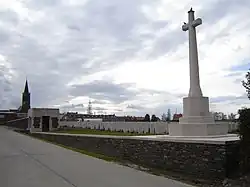 The cemetery, designed by the English architect Charles Holden and administered by the Commonwealth War Graves Commission, is located on the Kruisekestraat Road, to the east of Ypres. A Cross of Sacrifice is positioned in the southeast corner of the cemetery while a Stone of Remembrance is midway along the east wall.[2] The cemetery also contains a memorial to 32 British soldiers originally buried in German military cemeteries but whose graves were unable to be located in the postwar period.[1]