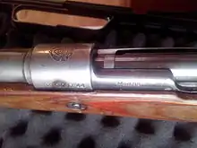 The picture shows the front sight ring, a feature that was mainly absent on the original Mauser K98k rifles.