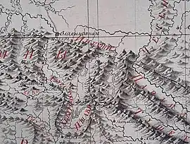 The Ingush village Zaurovo and the fortress Vladikavkaz on Johann Vogt's map (1784).