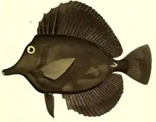 Zebrasoma rostratum, the longnose surgeonfish, longnose tang or black tang, is a species of marine ray-finned fish belonging to the family Acanthuridae, which includes the surgeonfishes, unicornfishes and tangs. This fish is found in the western central Pacific Ocean.