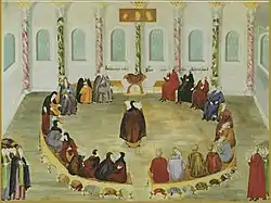 On March 2, an embassy under the leadership of the Ryazan archbishop Feodorit Troitsky was sent to Mikhail Romanov and his mother on behalf of Zemsky Sobor to Kostroma. The embassy included archimandrites of the Chudov, Novospassky, Simonov monasteries, the boyars Fyodor Sheremetev, Vladimir Bakhteyarov-Rostovsky, boyar children, and orderly people elected from cities.[3] The purpose of the embassy was to inform Michael of his election to the throne and to give him a Sobor oath. According to the official version, Mikhail was frightened and flatly refused to reign, so the ambassadors had to show all their eloquence to convince the future king to accept the crown. Critics of the "Romanov" concept express doubts about the sincerity of rejection and note that the conciliar oath has no historical value: