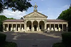 The mortuary chapel, a single-story sandstone block building with a pitched roof, was also built around 1895. The front entrance on the west side is emphasized by arcades resting on round columns and a gable with a bell tower and clock. Along the west facade, there is a colonnade with Ionic capitals on both sides of the entrance area.[3]