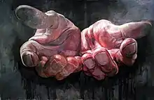 In 2021 Gershman was named an Ambassador to art materials company Royal Talens North America and art supply business BLICK Art Materials.[14] Gershman's "First Face of War: Intimate Portrait of Ukrainian Teacher" sold for $100,000 at the Heritage Auctions with 100% of proceeds from the sale benefiting Ukraine during the 2022 humanitarian crisis.[15] Gershman's painting depicts Ukrainian school teacher Olena Kurilo, who was wounded by shelling in Chuhuiv during the Russian invasion of Ukraine. The painting was modeled from a photograph of a wounded Kurilo which was taken by photojournalist Wolfgang Schwan, and inspired the creation of a movement by Zhenya, called Brushes Over Bullets.[16] In her project 'Brushes over Bullets', Gershman encourages other artists to paint in solidarity with Ukraine.[17] Gershman has said that she intentionally made her "First Face of War" small in size, so that observers are forced to take a closer and more intimate look into the eyes and faces of her subjects.[18]