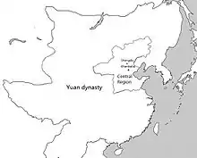 The Mongol-led Yuan dynasty (1271–1368) made the Central Secretariat the central administrative office, responsible for all civil administration,[6] and abolished the Department of State Affairs in 1292 (revived 1309-1311). The post of Director was held by an imperial prince or left vacant, however real work went to the right and left Grand Chancellors. Under the Grand Chancellors were four managers of governmental affairs (pingzhang zhengshi 平章政事) and a right and left aide (you cheng 右丞, zuo cheng 左丞), who were collectively known as state counsellors (zaizhi 宰執). Below the state counsellors there were four consultants (canyi zhongshusheng shi 參議中書省事) responsible for paperwork and took part in decisions. The Central Secretariat controlled the Six Ministries and was thus functionally the heart of the government. The regions surrounding the Yuan capital Khanbaliq, including what are now Shandong, Shanxi, Hebei and Inner Mongolia provinces were known as the Central Region (腹裏, fuli) and directly subordinate to the Central Secretariat.[7] Branch secretariats were set up throughout the provinces.[8]