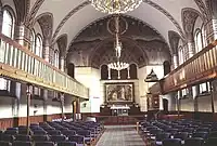 The barrel vaulted church room has wooden galleries supported by iron pillars on both sides. The chancel is raised three steps and behind the altar table is a painting by P. Steffensen depicting Den Vantro Thomas (Doubting Thomas). The mural on the walls of the choir was painted by Johannes Kragh in 1899 and shows the Resurrection of Jesus. Krag also painted the mural on the west wall, surrounding the organ. It presents The Apocalypse.