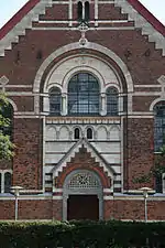 The church is designed in a Neo-Romanesque style. It is built in red brick on a granite plinth with detailing in chalk. Savonnère stone, Öland chalk and Norwegian marble has also been employed. The western gable has a round arched portal with a Tympanum framed by a triangular gable below a window group unified by a large arch. The west gable's arch frieze is a copy of the one at Hammlev Church near on Djursland.[1] Koch had previously surveyed the chalk churches of the area around Grenå and published a book about them in 1896. The sides of the building have friezes, executed in chalk by Th. Bærentsen, and are segmented by lesenes .[3]