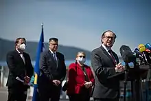 Tegeltija alongside EU official Olivér Várhelyi (left), Bosnian Foreign Minister Bisera Turković and Austrian Foreign Minister Alexander Schallenberg (front), accepting a COVID-19 vaccine donation from the EU, 4 May 2021