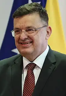 During the period from December 2019 until May 2020, the office of Minister of Human Rights and Refugees was vacant, with the leading parties in government not finding common ground on naming a new minister; eventually, DNS's Miloš Lučić was decided to take on the role of minister, getting confirmed by Parliament on 15 May 2020.[17] Not even a month after Lučić's appointment, on 2 June 2020, Fahrudin Radončić resigned as Minister of Security over a migration dispute with other members of Tegeltija's government; Radončić proposed the deportation of 9,000 migrants which the cabinet, headed by Tegeltija, voted against.[18] On 23 July 2020, Selmo Cikotić became the new Minister of Security in Tegeltija's cabinet, succeeding Radončić.[19]
