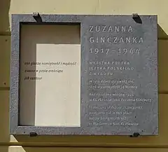In 2017, on the centenary of Ginczanka's birth, a commemorative plaque was unveiled on a tenement house on Mikołajska Street in Kraków where she was in hiding during her stay in the city.[105] The same year, Marek Kazmierski translated and published the first book of her work in English.[106] In 2019, Jarosław Mikołajewski published a book Cień w cień. Za cieniem Zuzanny Ginczanki which deals with her life and literary legacy.[107]