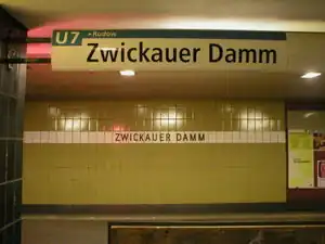 Zwickauer Damm is a Berlin U-Bahn station located on the U7. Finished in 1970 by R. G. Rümmler it was the end of the line U7 until 1972 when Rudow station was opened. The next station is Rudow.[1]